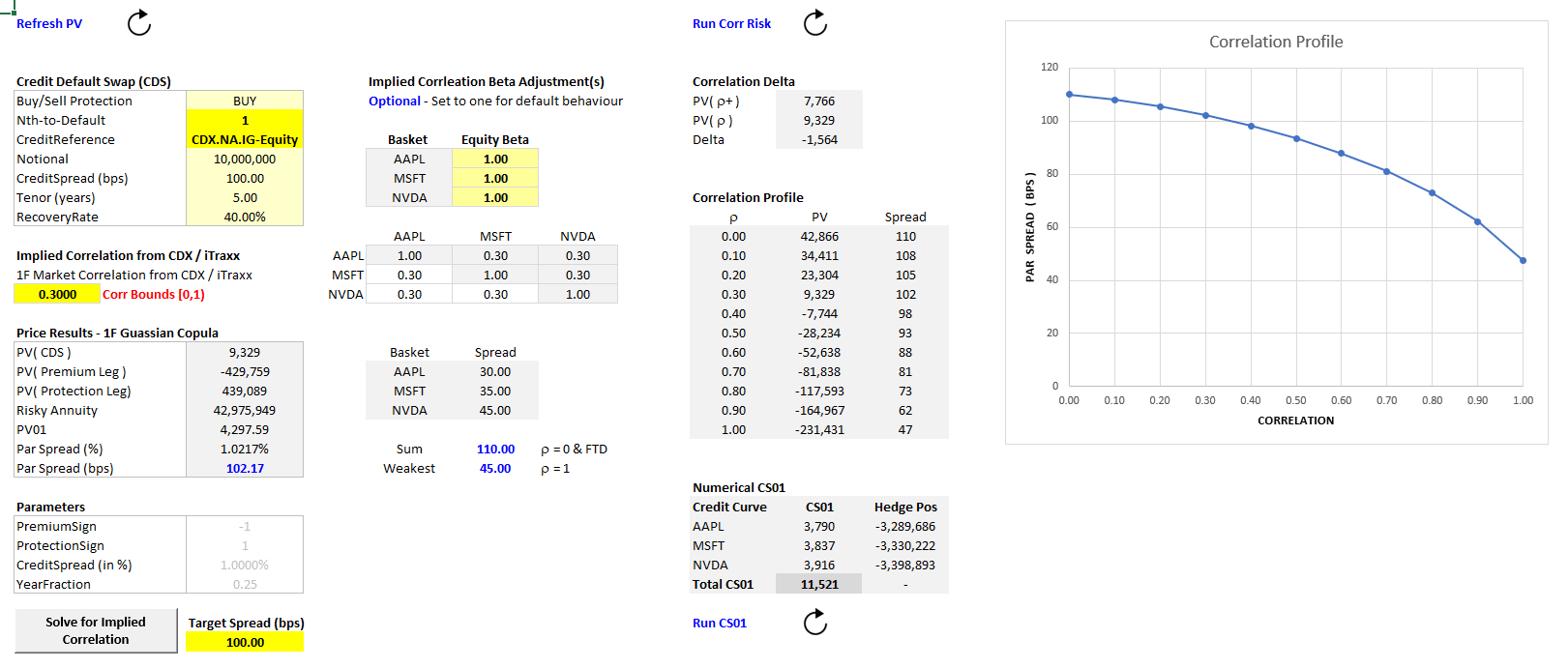 For demonstration purposes we create a simplified toy pricing kernel that mimics the structure of a credit derivative model. The function takes yield curve inputs, credit spreads, and correlation parameters and produces a price. Although simplified, it contains nonlinear rate effects, spread sensitivity, and correlation interaction.
