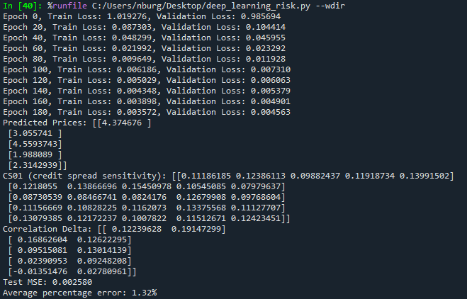 Below is a concise well-commented PyTorch example of how to price and compute the real-time risk for exotic credit using nth-to-default CDS as an example using dummy data. Whilst the training may take some time, this only needs to be done once, after which pricing and risk computes in real-time, see below (far-bottom) for the risk results.