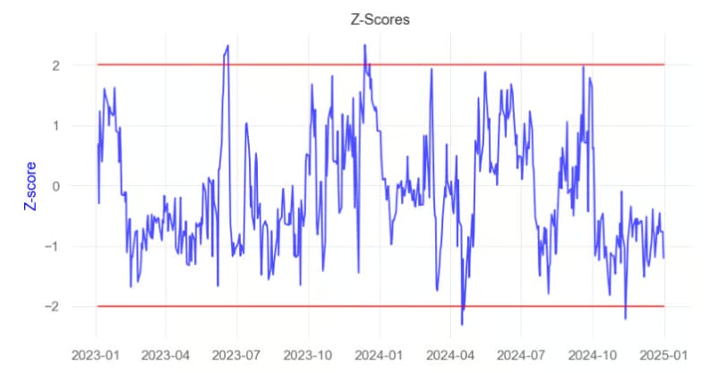 This z-score is our trading signal. We monitor it for mean reversion, optionally test for stationarity, and estimate the half-life using an Ornstein–Uhlenbeck regression to calibrate expected holding periods.